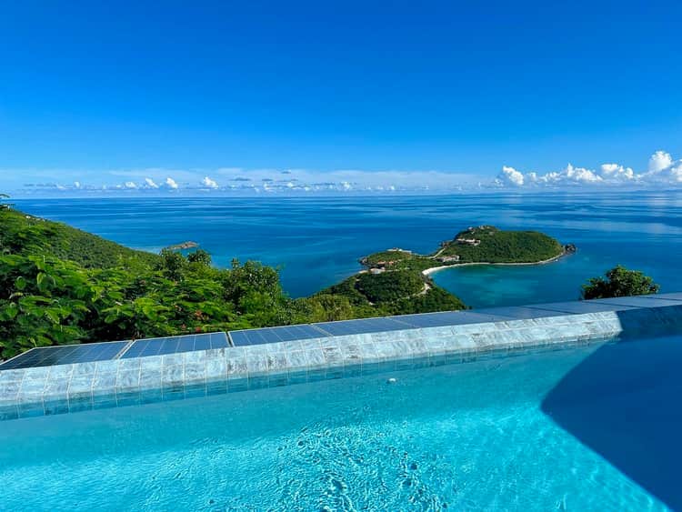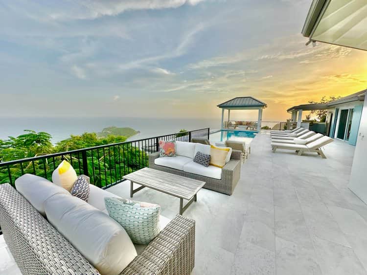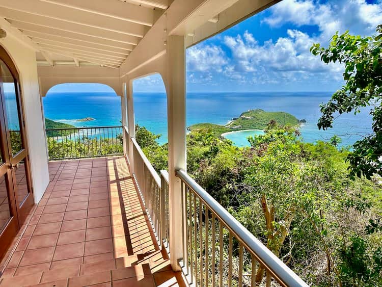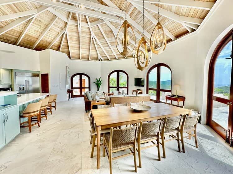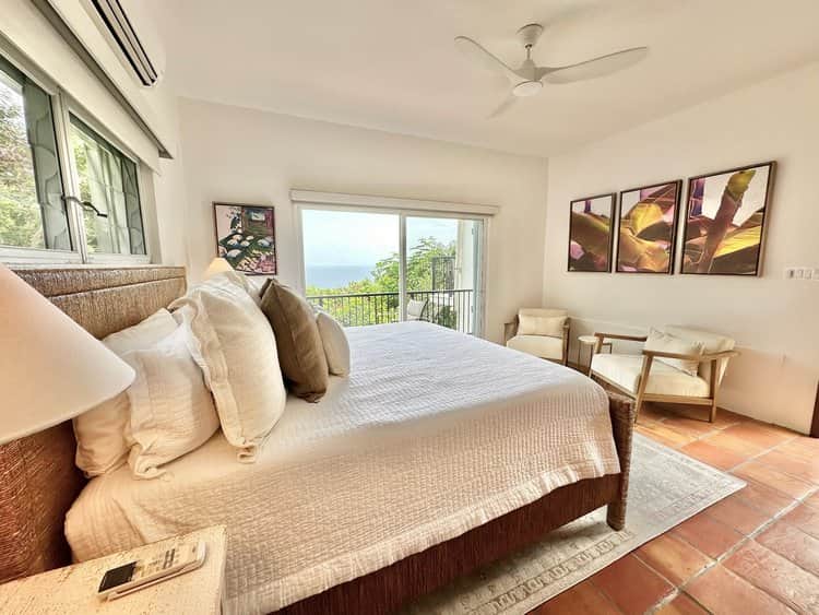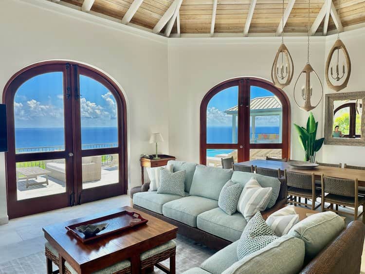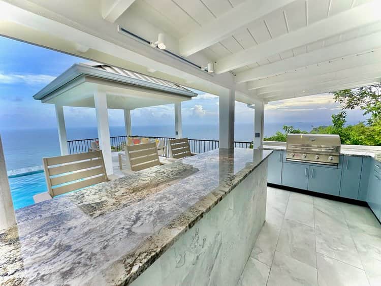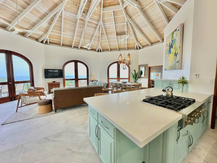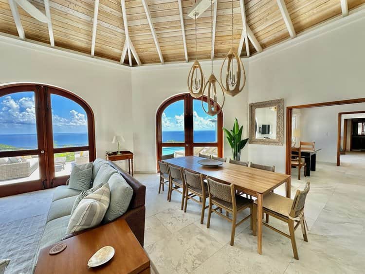 High above the stunning clear water Rendezvous Bay in the elegant Estate Rendezvous neighborhood lies Villa Panache. A tropical garden of swaying palms lines the easy access semi-circle driveway leading you to the breathtaking entrance of this 6-bedroom villa. The massive blue and turquoise views will instantly capture you as you walk across the expansive deck along the 30-foot swimming pool lined with chaise lounges and cozy outdoor living spaces. A shaded gazebo to relax in and the outdoor kitchen provide a day-and-night outdoor living oasis. You will be swept away to paradise as you enter the air-conditioned great room framed by huge mahogany archways that welcome in the breeze and endless views.