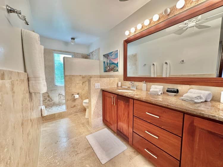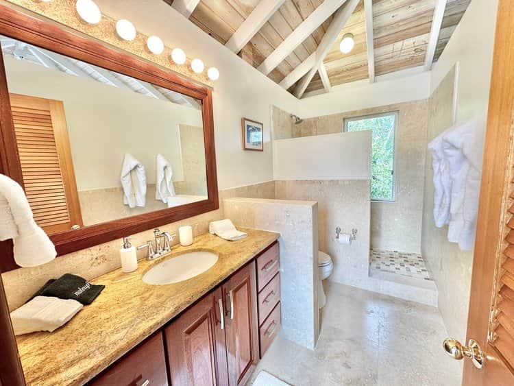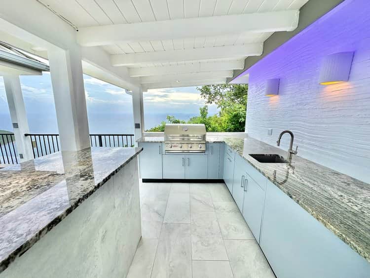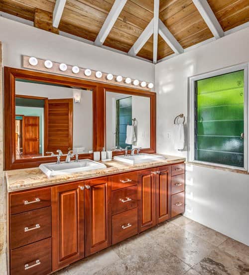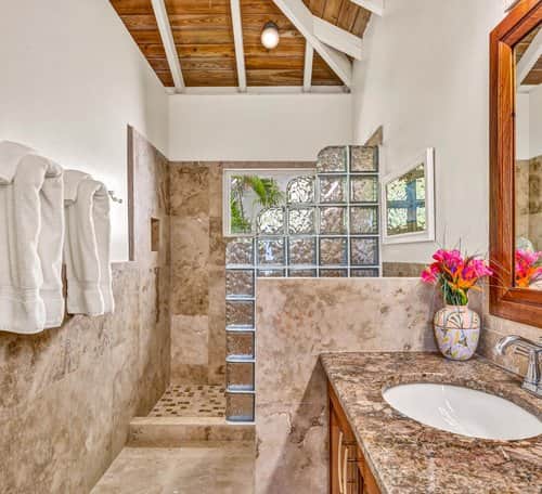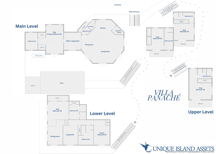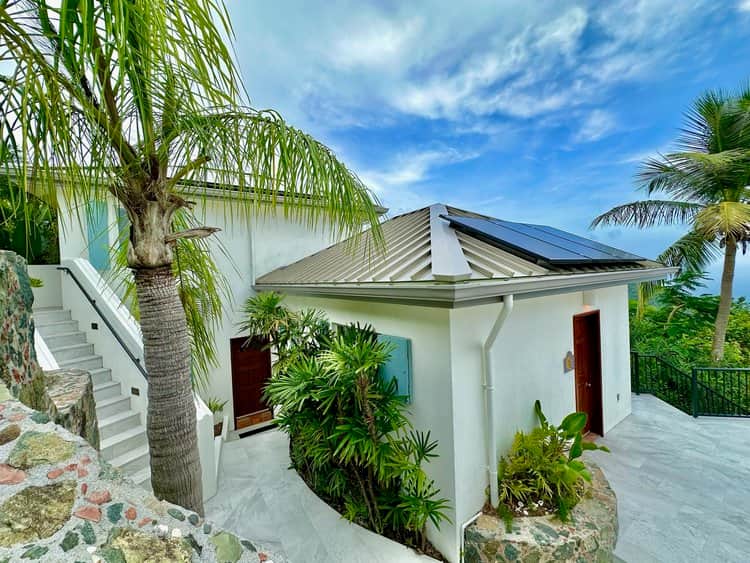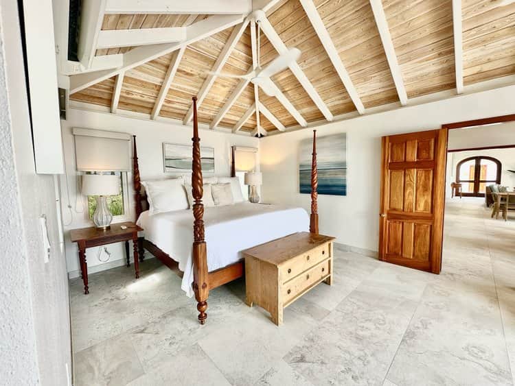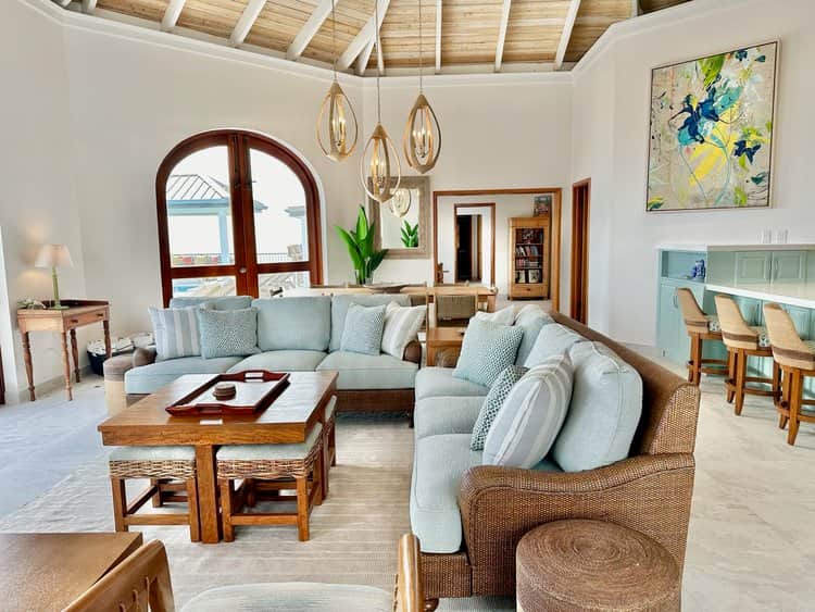 High above the stunning clear water Rendezvous Bay in the elegant Estate Rendezvous neighborhood lies Villa Panache. A tropical garden of swaying palms lines the easy access semi-circle driveway leading you to the breathtaking entrance of this 6-bedroom villa. The massive blue and turquoise views will instantly capture you as you walk across the expansive deck along the 30-foot swimming pool lined with chaise lounges and cozy outdoor living spaces. A shaded gazebo to relax in and the outdoor kitchen provide a day-and-night outdoor living oasis. You will be swept away to paradise as you enter the air-conditioned great room framed by huge mahogany archways that welcome in the breeze and endless views.
